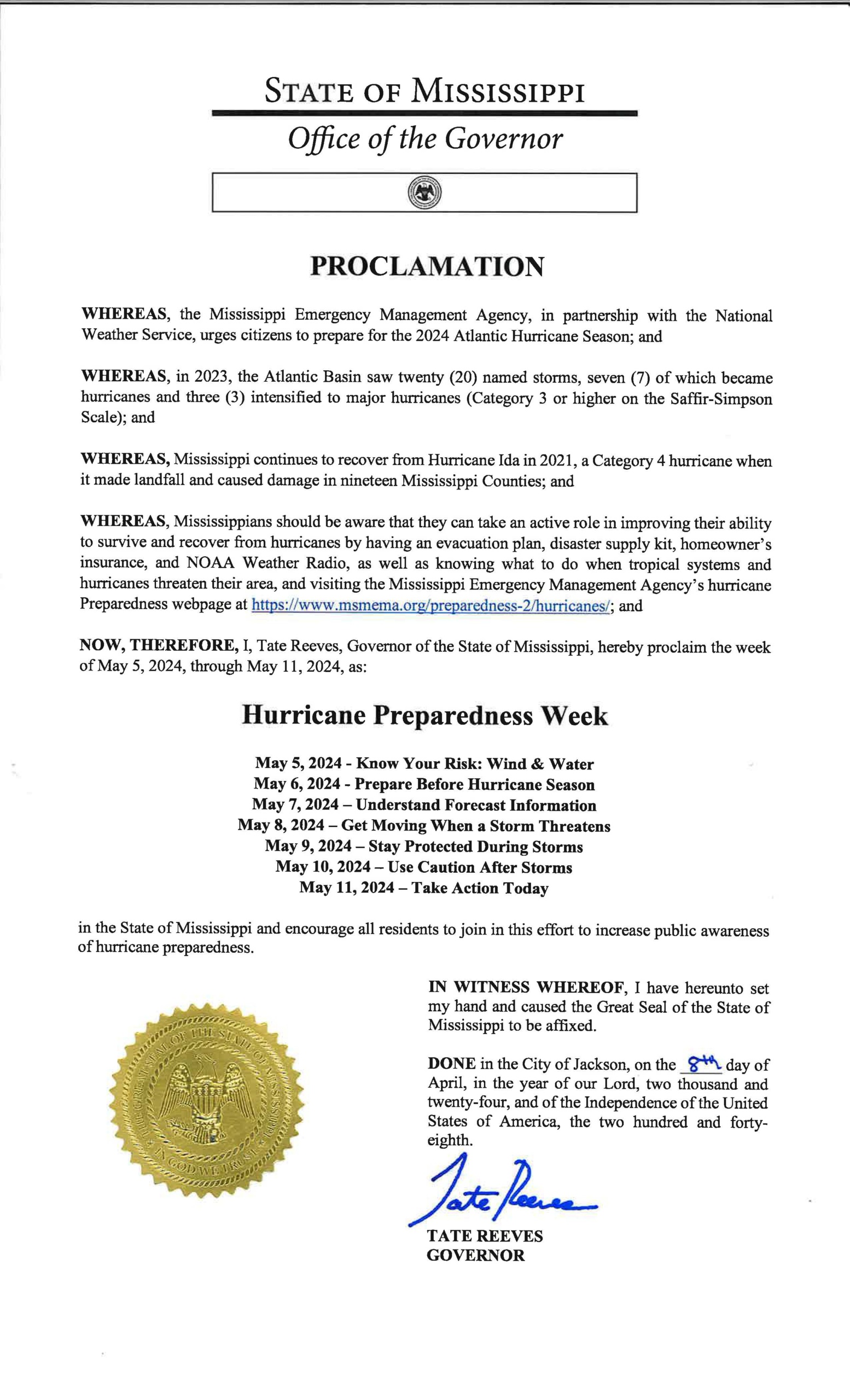 PEARL, Miss. (MEMA) – Governor Reeves declared May 5 – May 11, 2024, Hurricane Preparedness Week for the State of Mississippi. The Mississippi Emergency Management Agency urges citizens to prepare for the 2024 Atlantic Hurricane Season. Last year, The Atlantic basin saw 20 named storms, which ranks fourth for the most-named storms in a year since 1950. Of those storms, seven were hurricanes, and three intensified to major hurricanes.