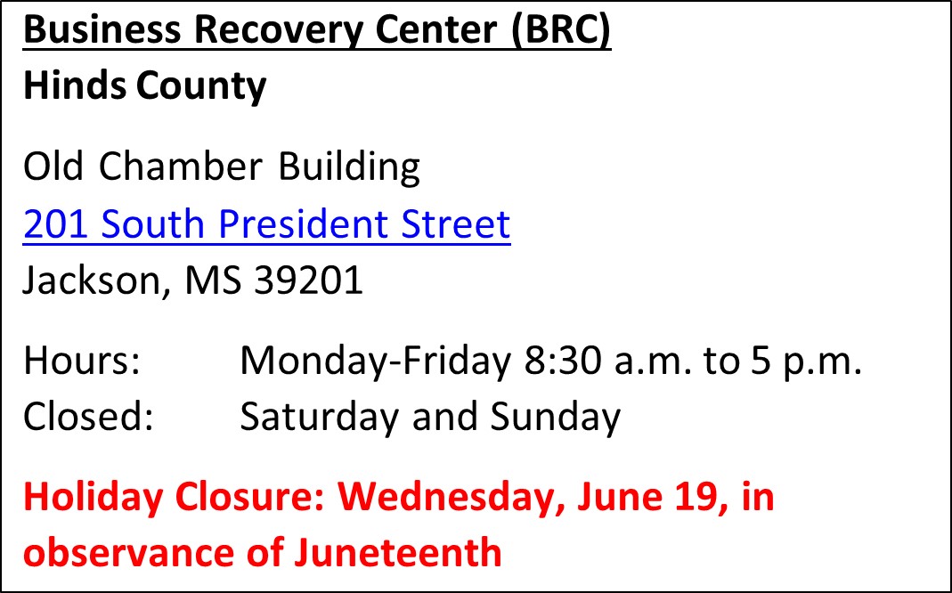ATLANTA – The U.S. Small Business Administration (SBA) announced today it will temporarily close its Business Recovery Center (BRC) in Jackson on Wednesday, June 19 in observance of the Juneteenth Holiday. The center will resume normal operations on Thursday June 20. The SBA opened its Center to assist those affected under the President’s major disaster declaration for losses due to severe storms, straight-line winds, tornadoes and flooding on April 8-11 apply for low-interest disaster loans.