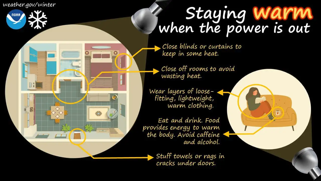 Have flashlights with extra batteries on hand, keep your cell phone charged and have blankets to help you stay warm